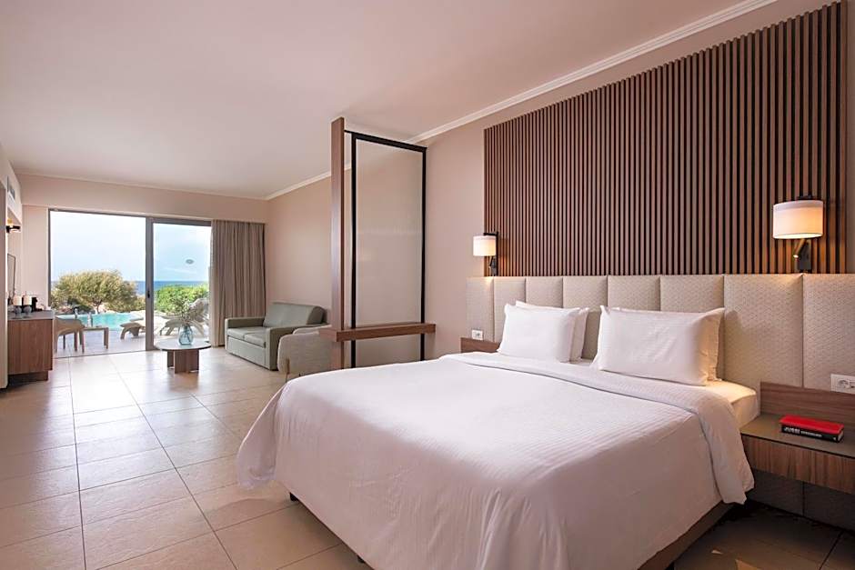 Spacious and bright room with modern decor features a private pool with a sea view.